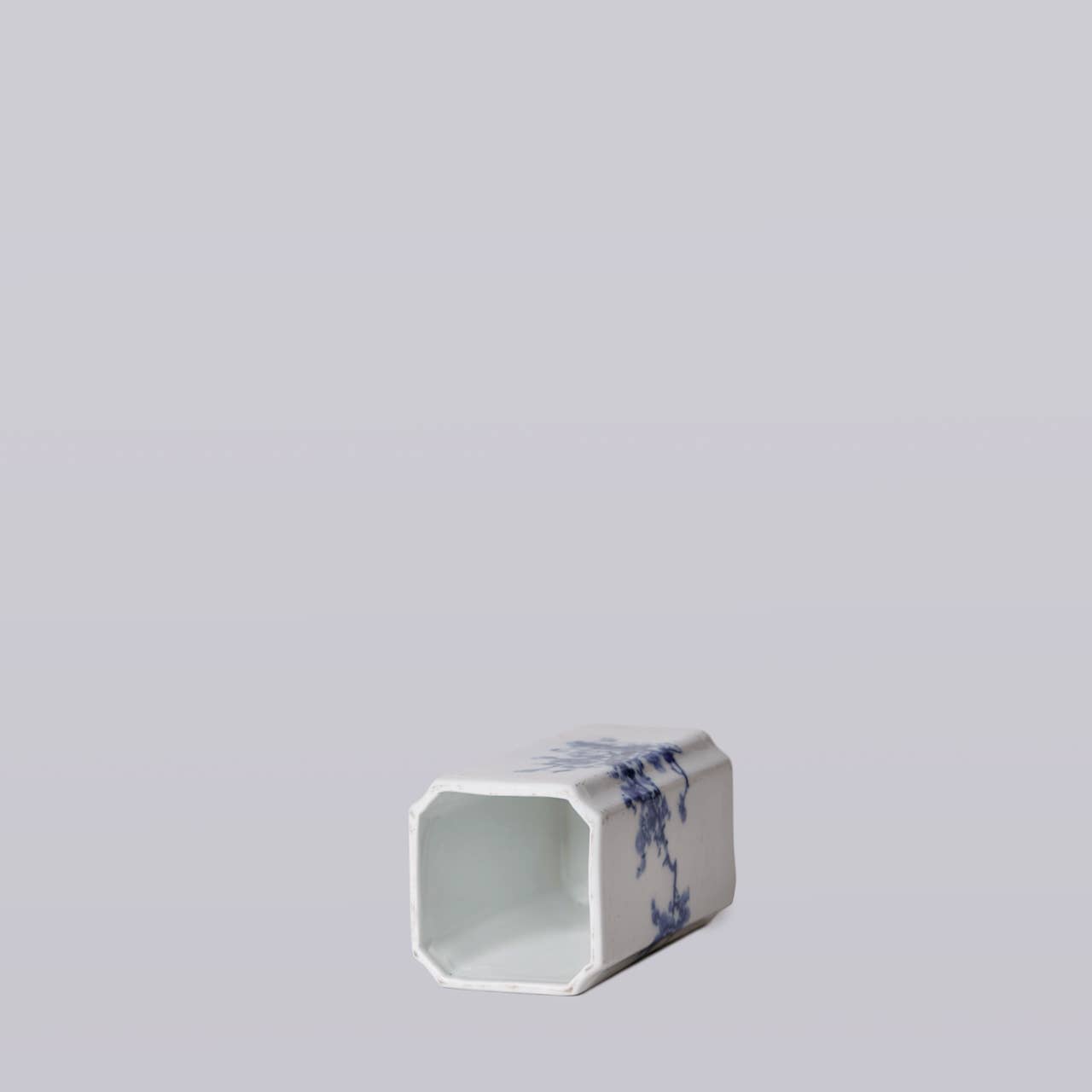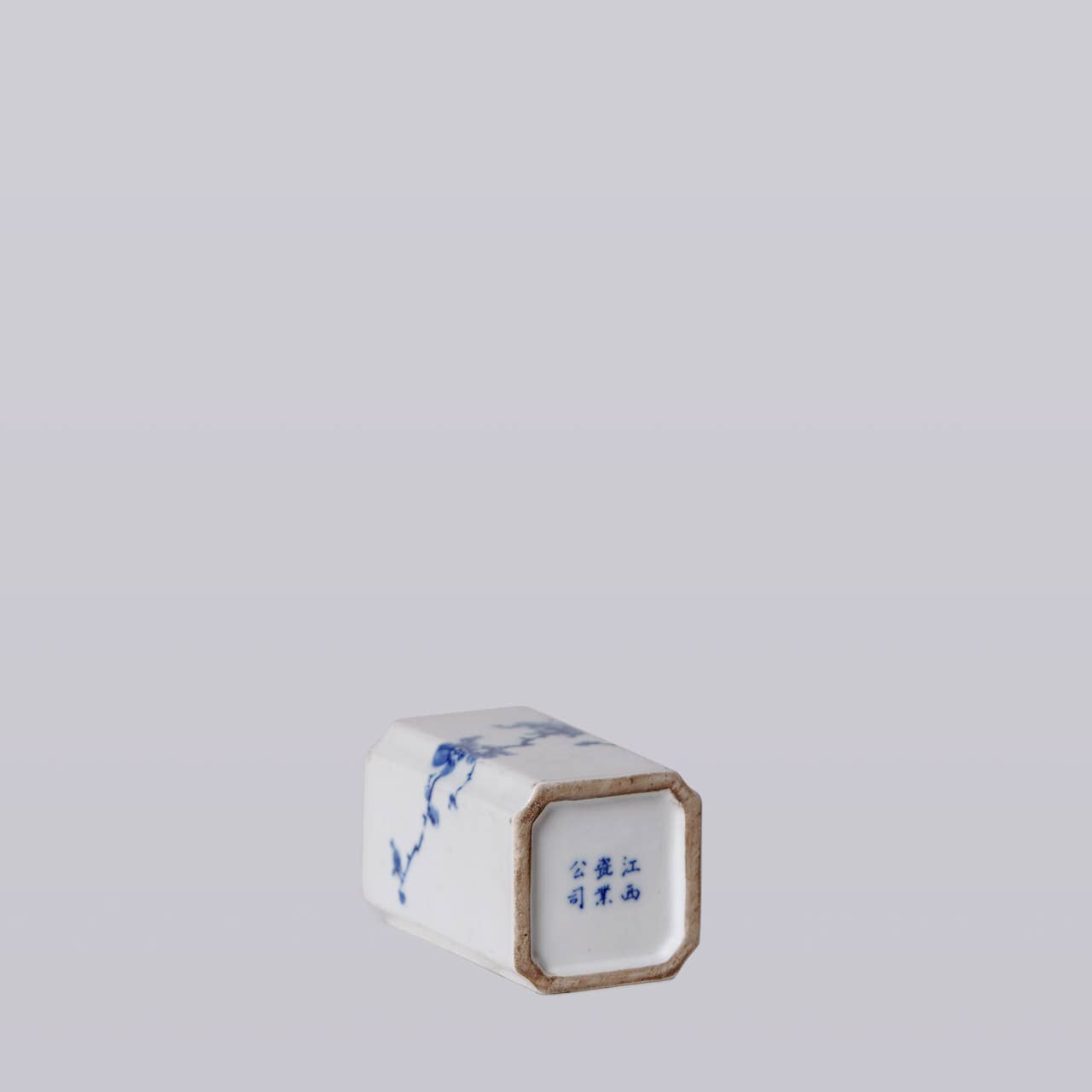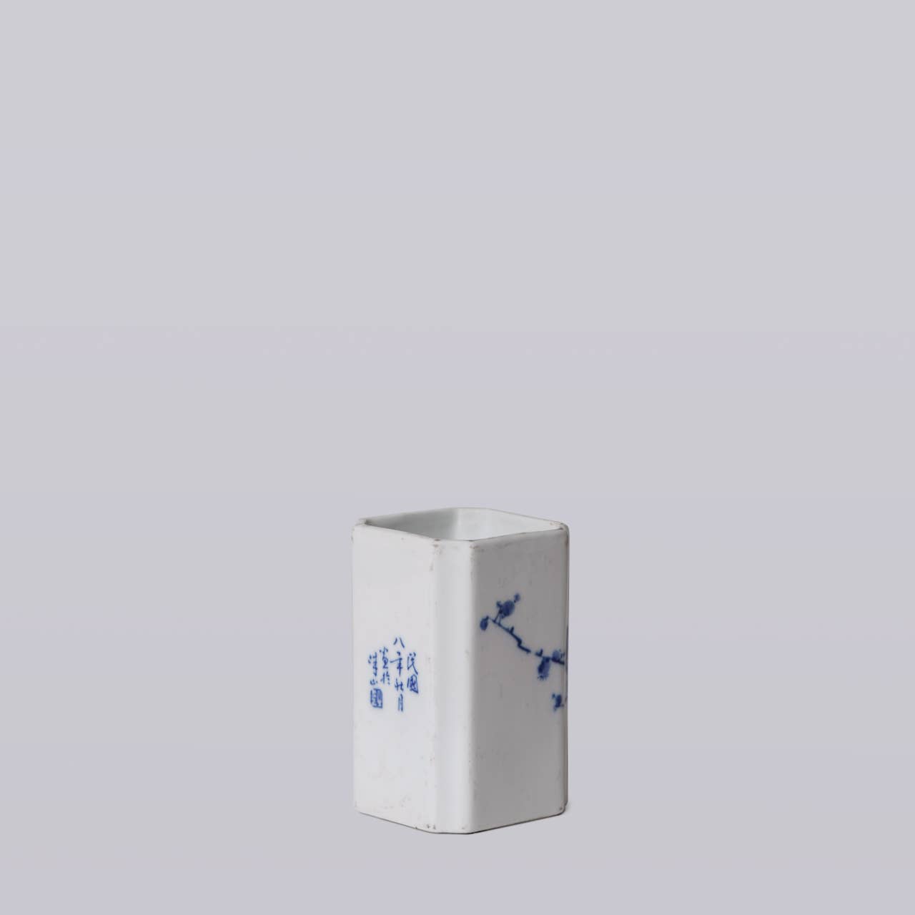 Small blue and white porcelain square vase with a cherry blossom motif. The style and form are reminiscent of 1920s wares of the early Chinese republic.