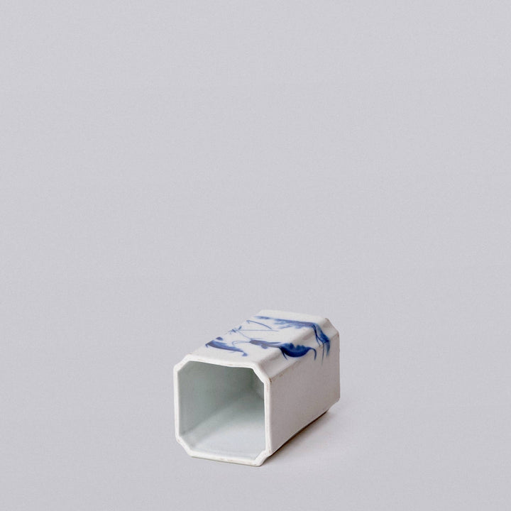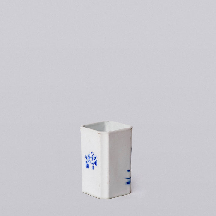 Small blue and white porcelain square vase with a fish motif. The style and form are reminiscent of 1920s wares of the early Chinese republic.