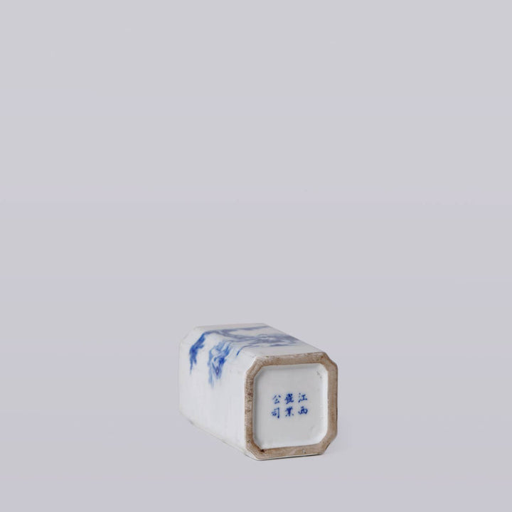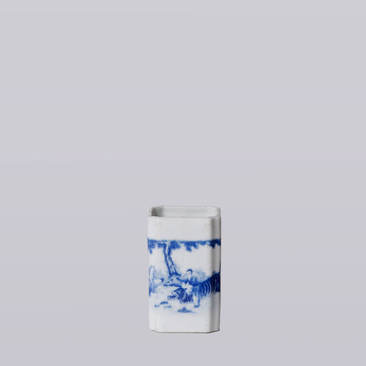 Small blue and white porcelain square vase with a tiger motif. The style and form are reminiscent of 1920s wares of the early Chinese republic.