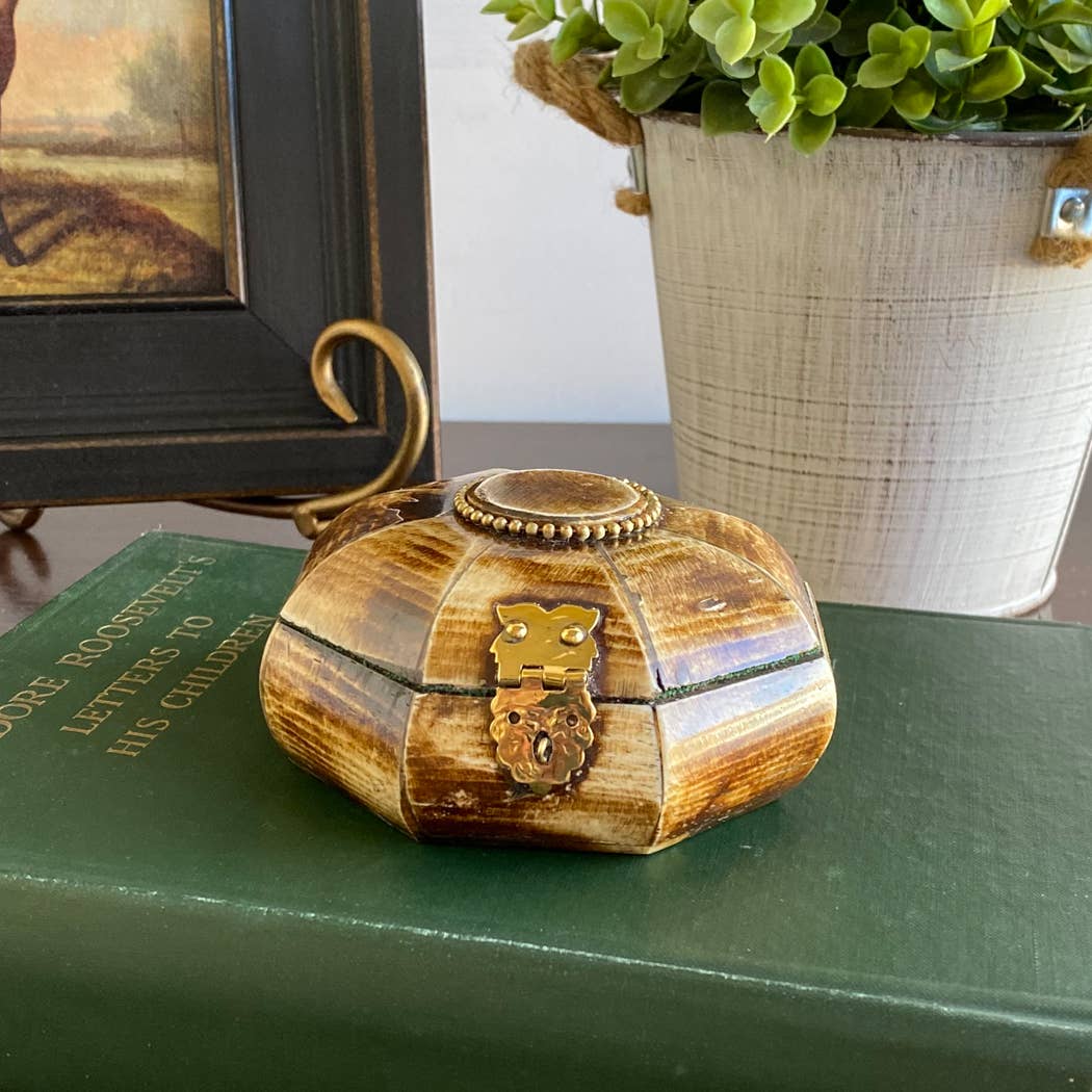 These primitive boxes are beautiful reproductions of a Colonial Era trinket box. Made of solid ox bone, they feature a hinged lid and green velvet lining. Note: These are NEW reproductions made out of natural materials. Variations in color of wood and ox bone are natural and to be expected and add to their unique character. Additionally, they are made to look old and rustic, so cracks in the wood and other similar issues are normal.