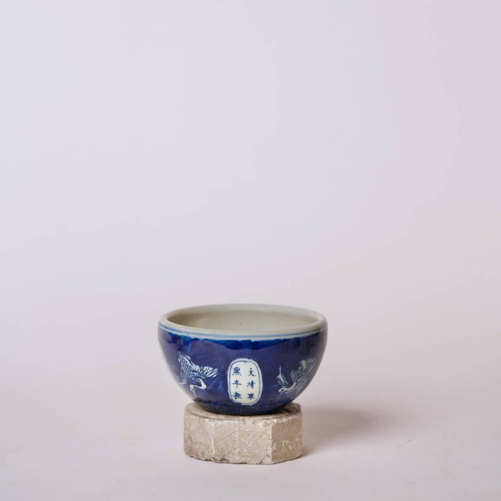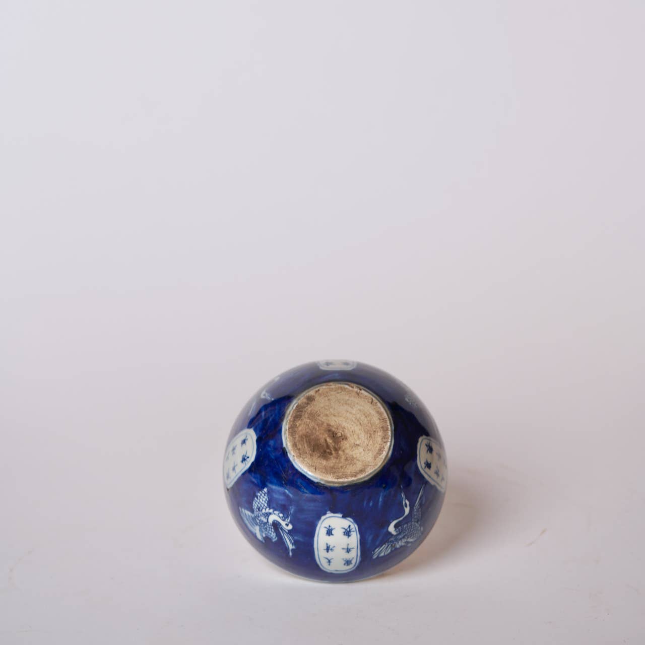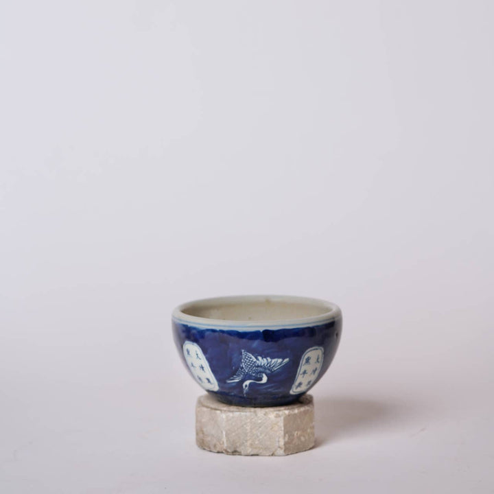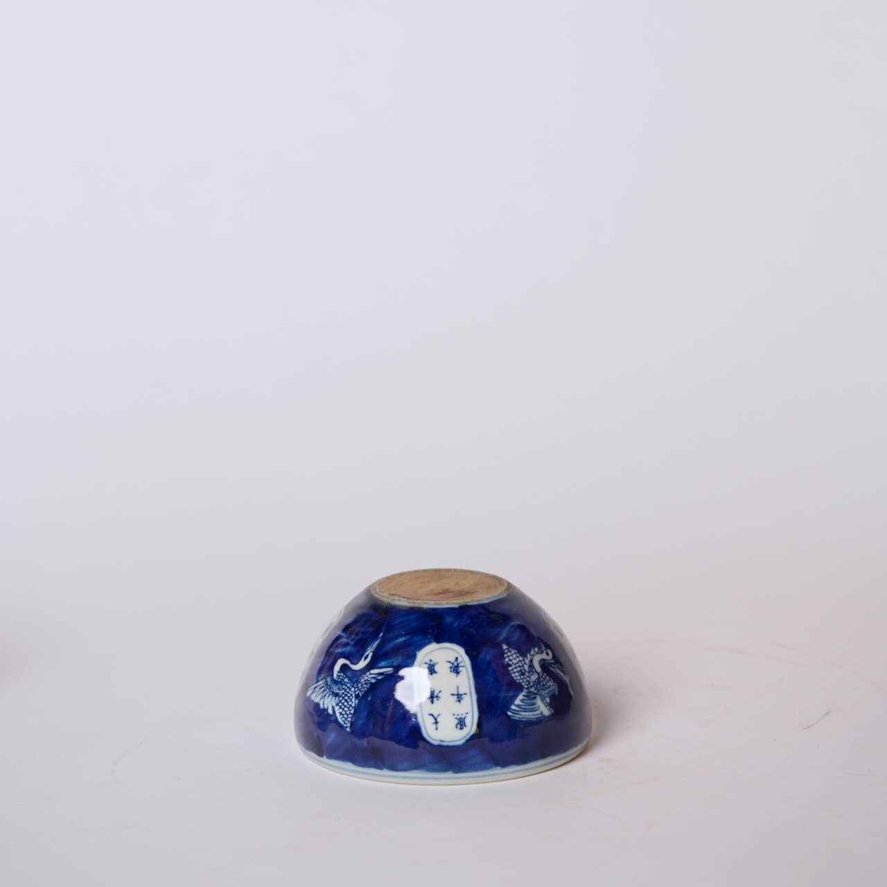 Small blue and white porcelain bowl with an dancing crane motif and a Kangxi reign cartouche