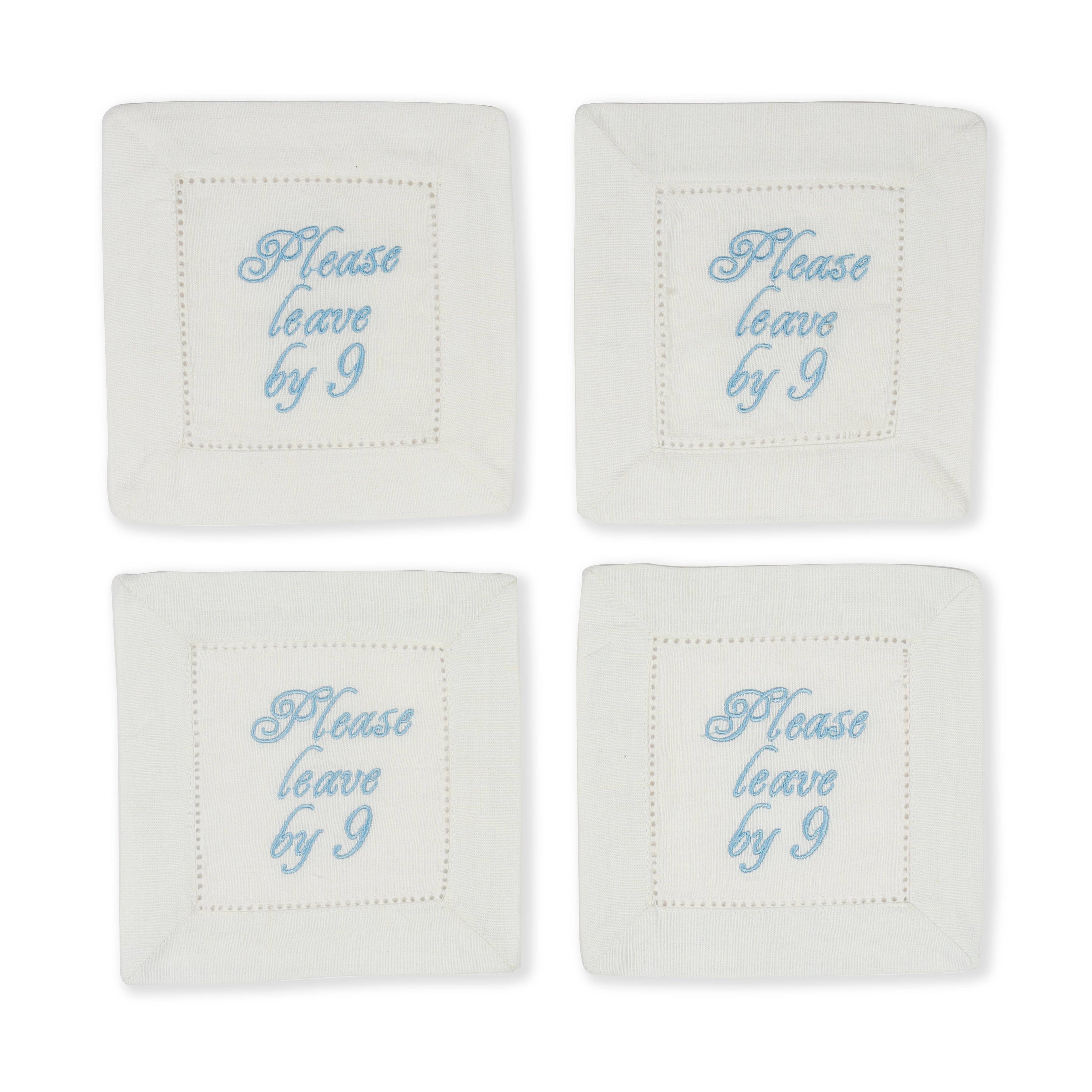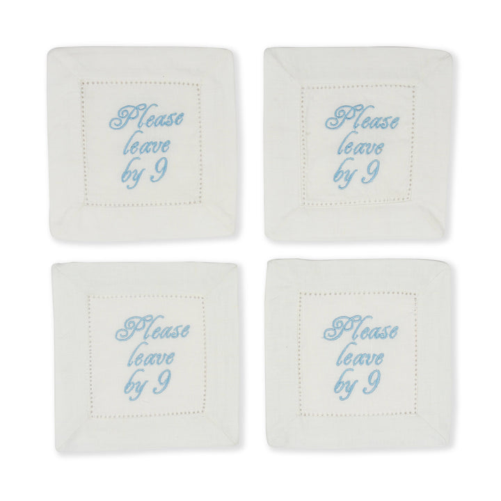 Ensure your cocktail parties end on a light-hearted note with our Please Leave by 9 embroidered cocktail napkins. These napkins feature a charming hand-embroidered reminder for guests to head home at a reasonable hour. Made from 100% linen, they add a touch of humor and refinement to your gatherings.
