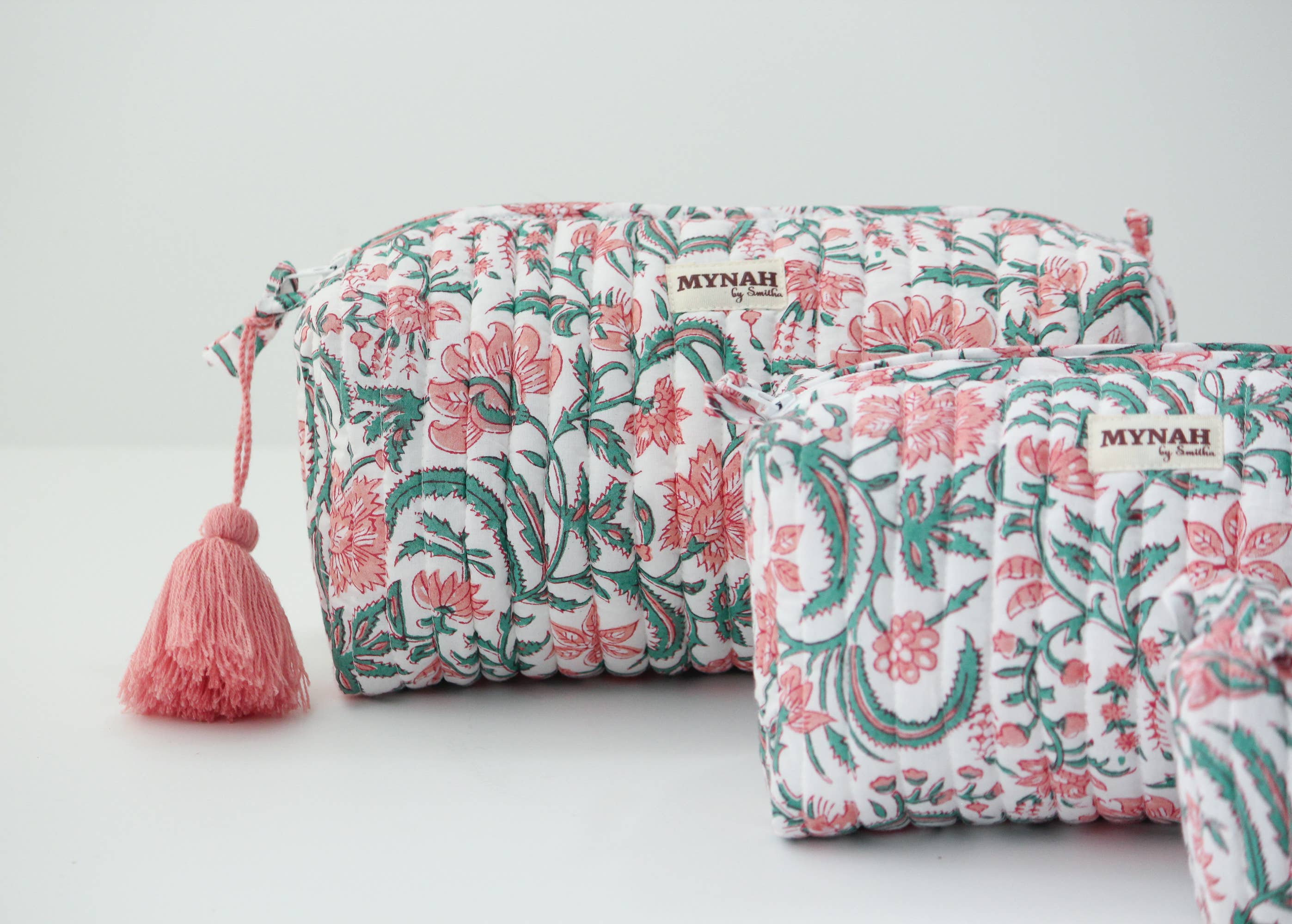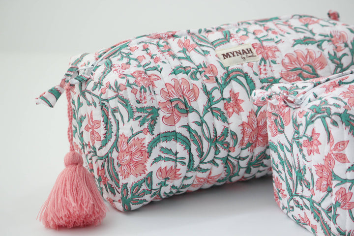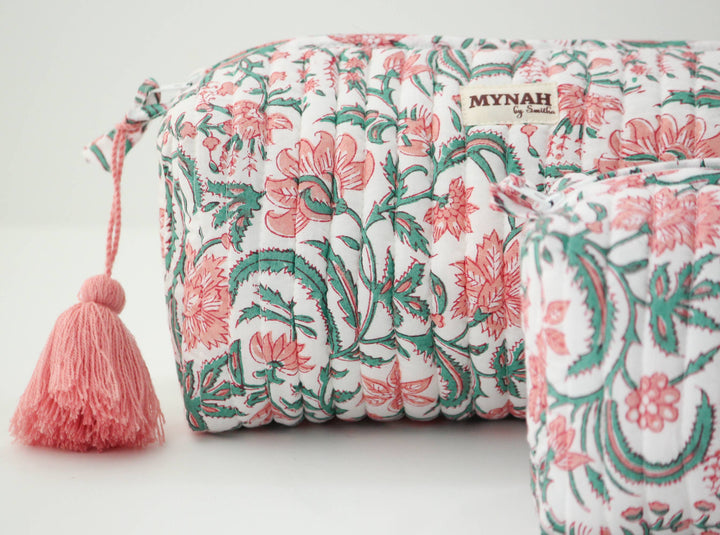 Hand block printed quilted makeup/toiletry bag with waterproof lining.