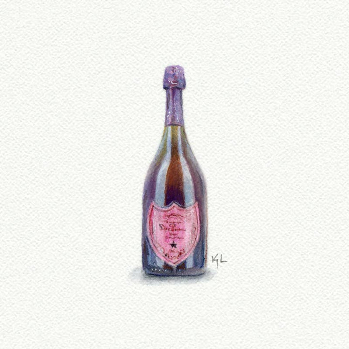 Miniature watercolor print of a Dom Perignon champagne bottle by artist Karen Libecap. This reproduction is digitally scanned and printed at actual size of original painting on fine art matte paper that provides vibrant color and exceptional detail using archival inks guaranteed to last 100 or more years.