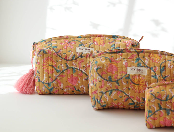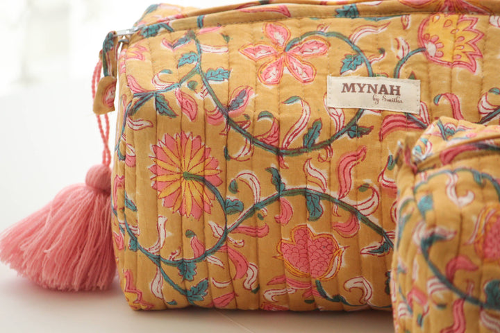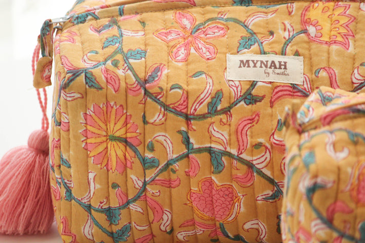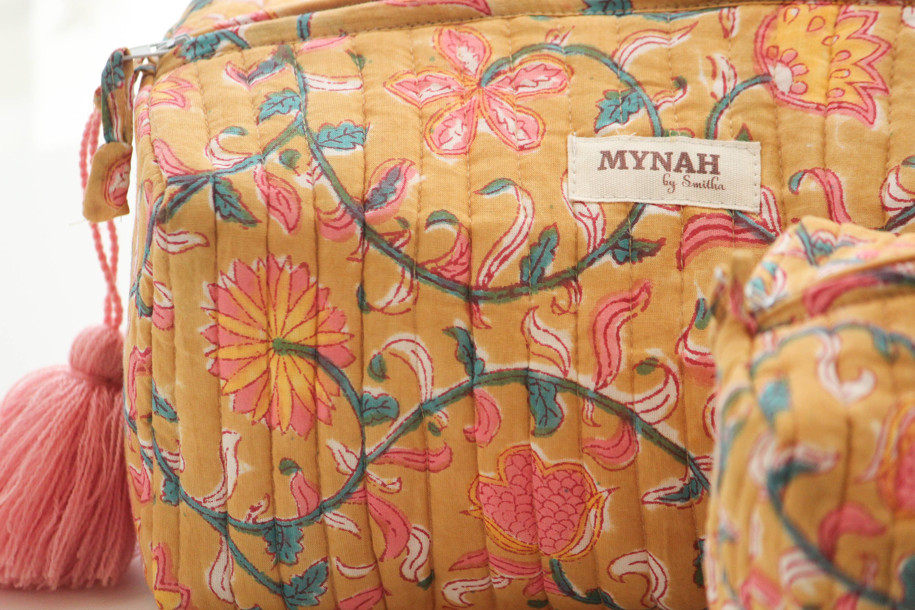 Hand block printed quilted makeup/toiletry bag with waterproof lining.