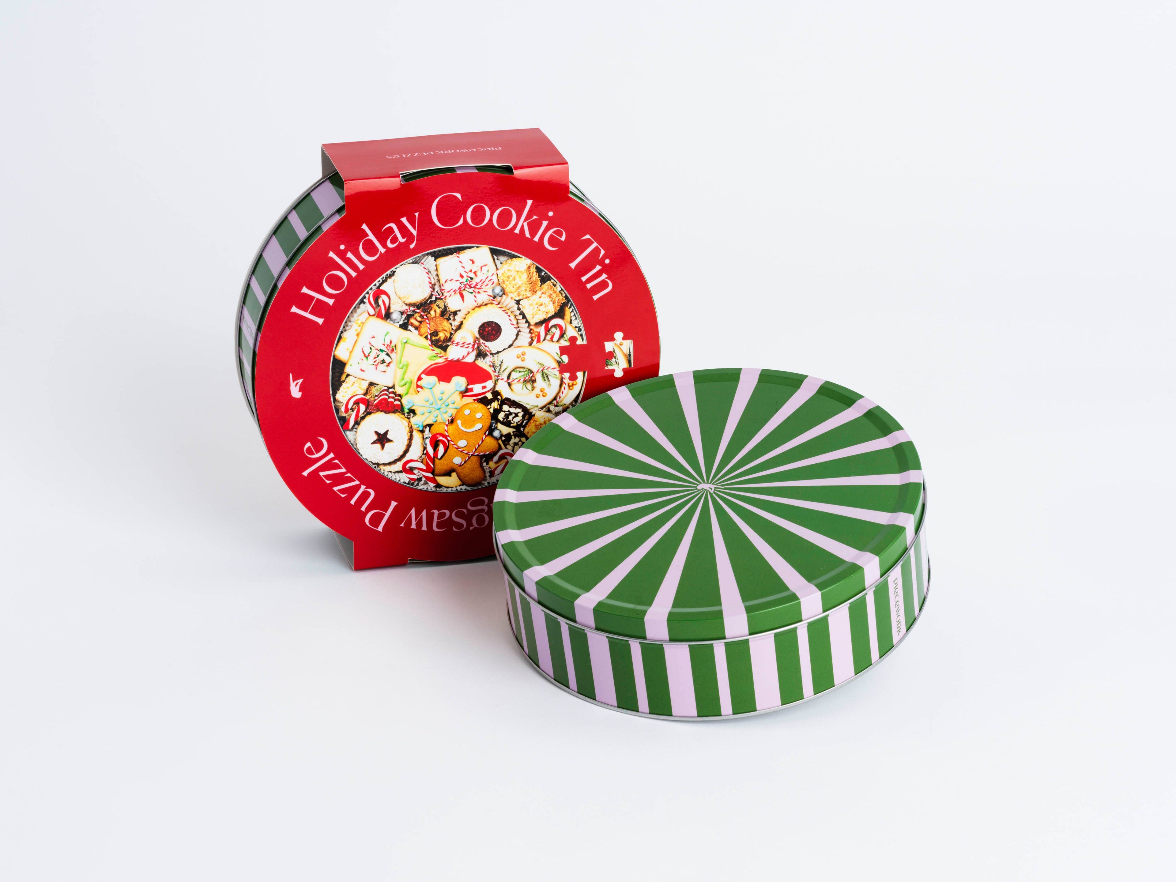 The Holiday Cookie Tin Jigsaw Puzzle from Piecework Puzzles is chock-full of holiday cheer. This round puzzle comes in a collectible candy-striped tin — a gift that keeps on giving.