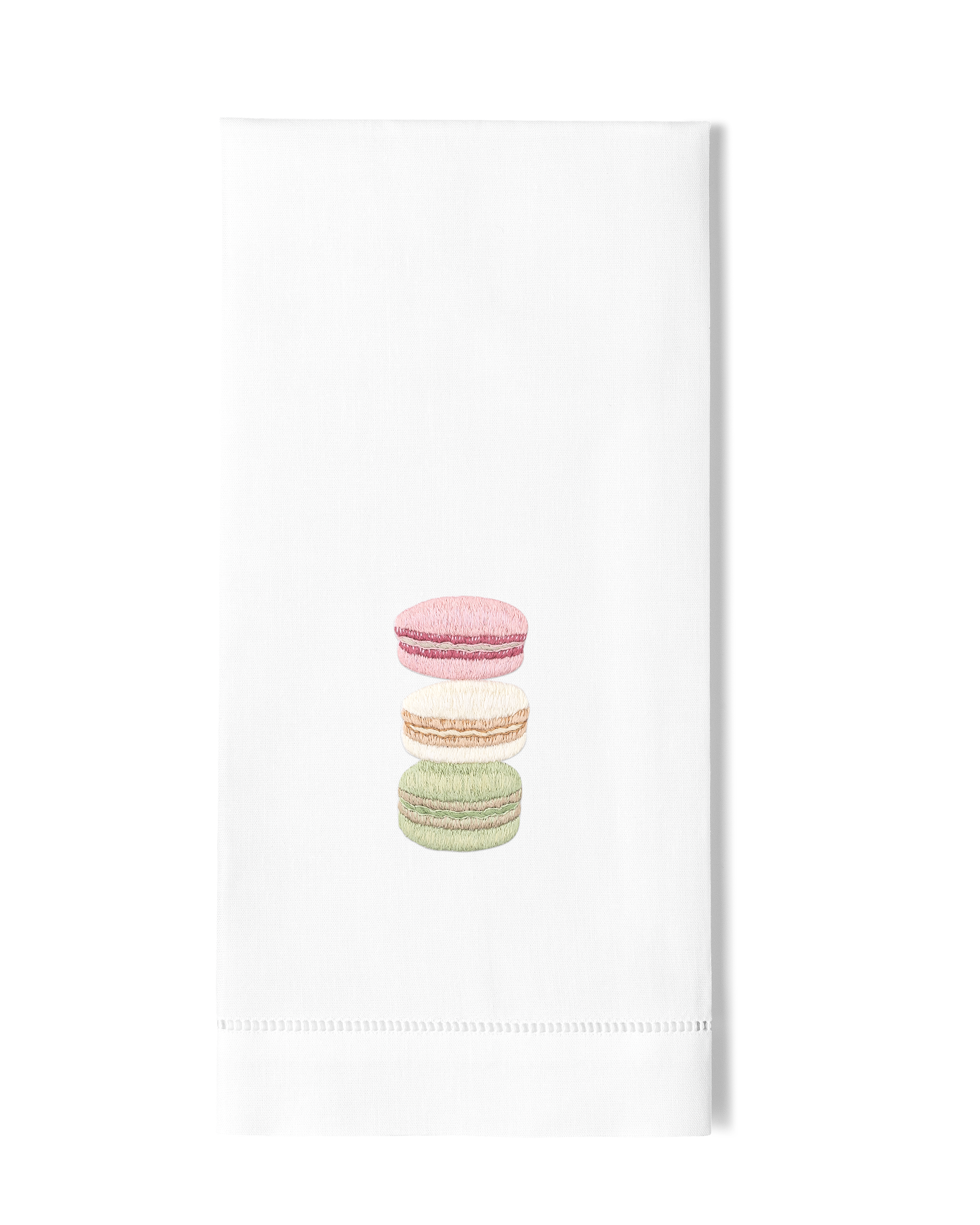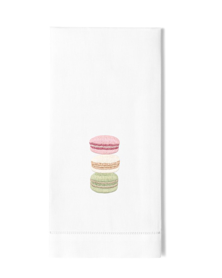 Très chic? Oui. Bring Parisian style into your kitchen with this gorgeous hand towel featuring a stack of adorable macarons. Hand embroidered towel on 100% cotton, finished and hemstitched by hand.