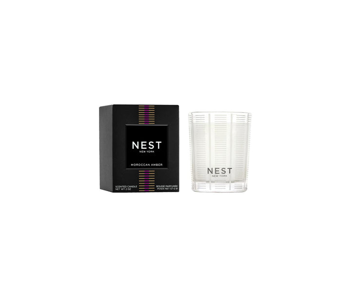 NEST's Moroccan Amber candle features exhilarating notes of moroccan amber, sweet patchouli, heliotrope, and bergamot with a hint of eucalyptus.