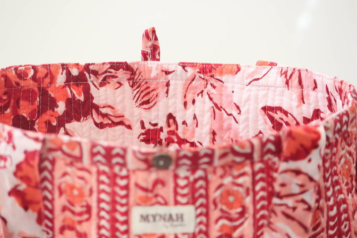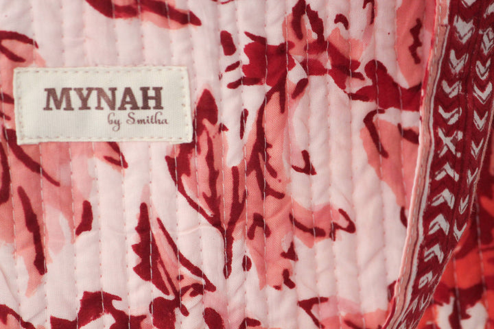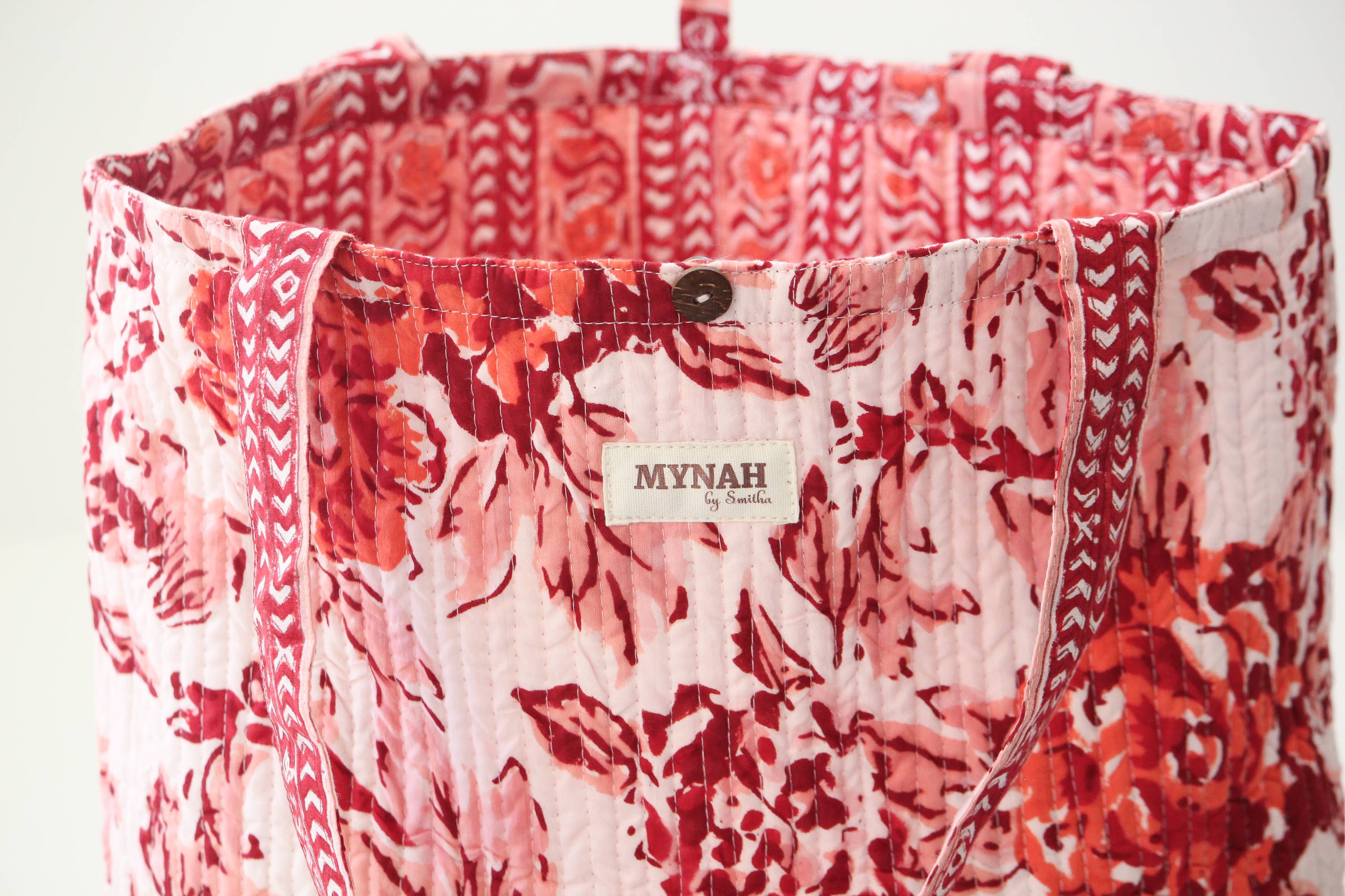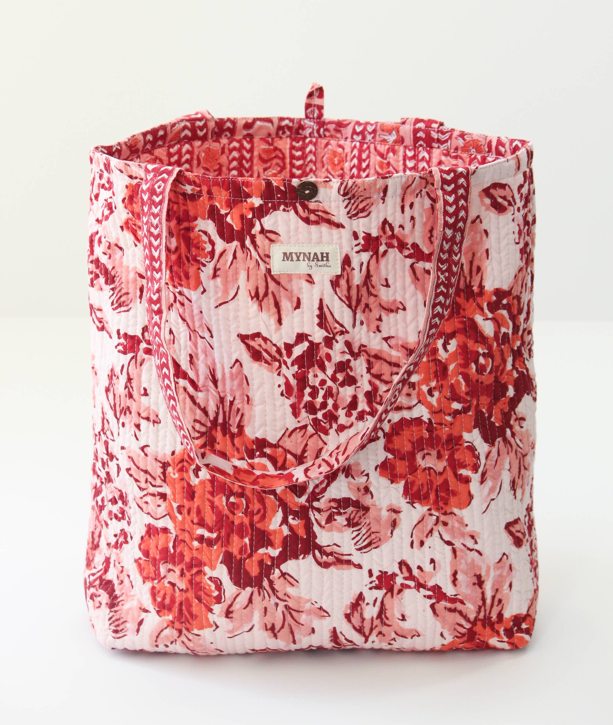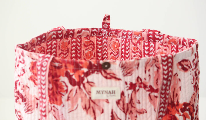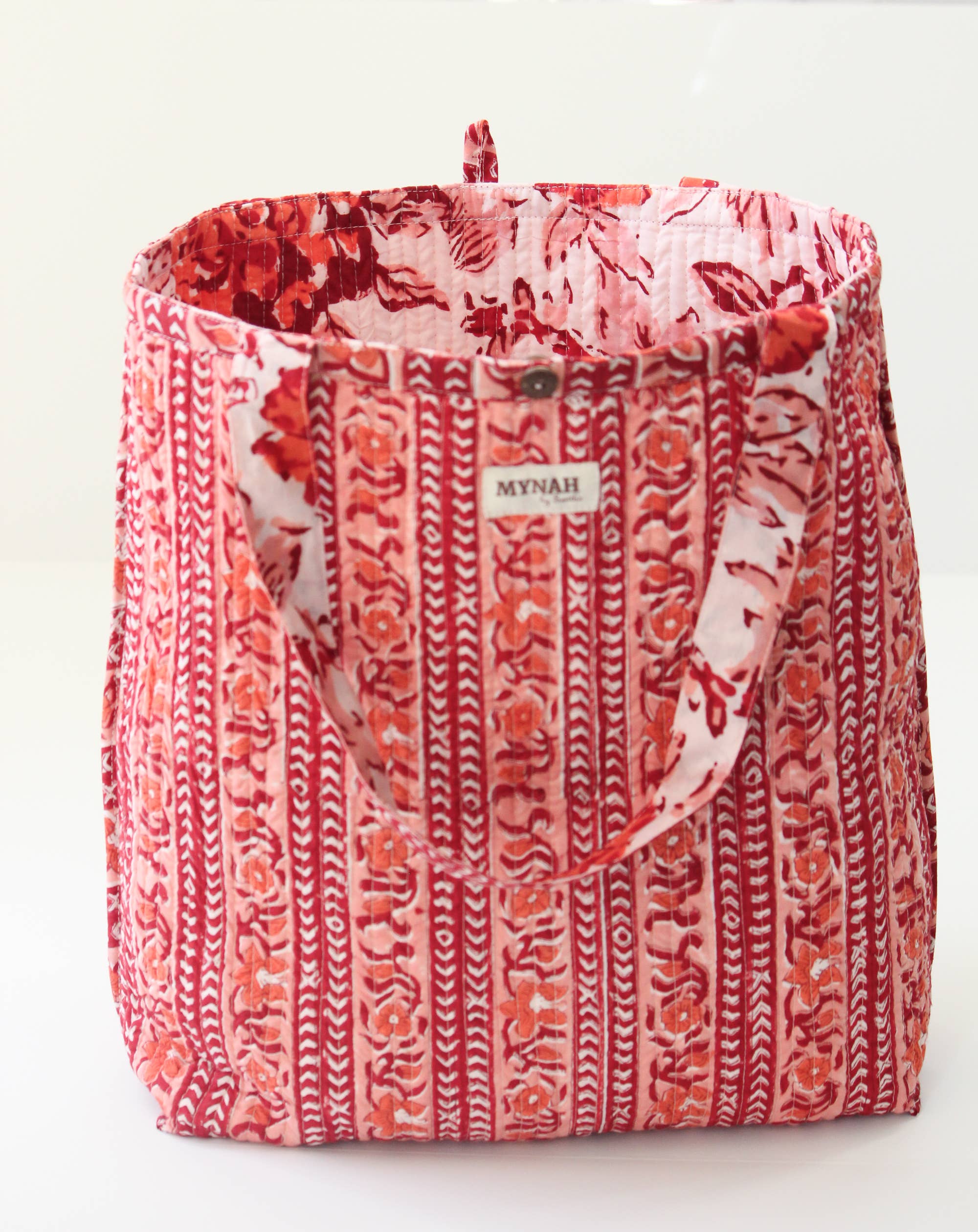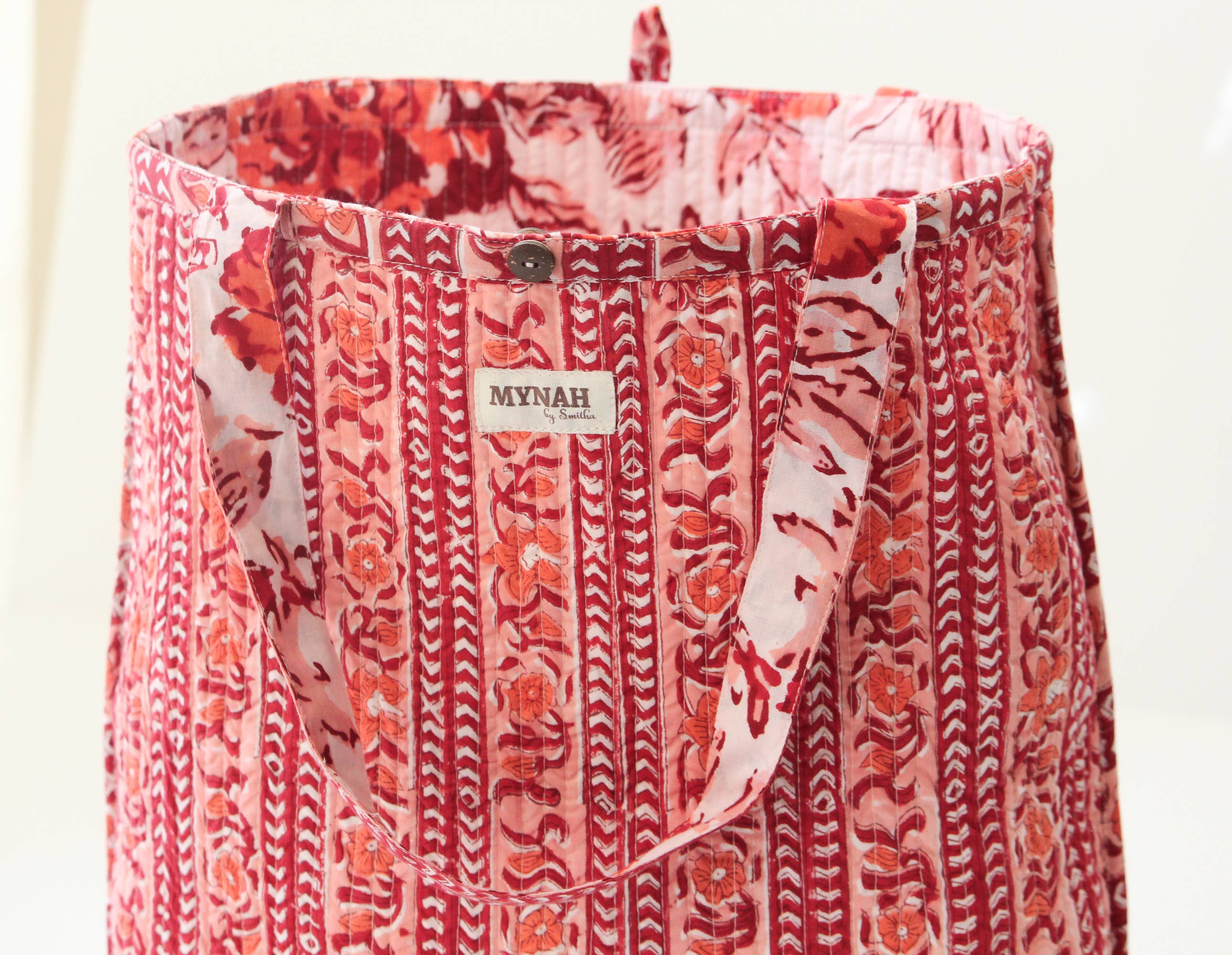 Gorgeous hand block printed quilted tote bag with reversible design.