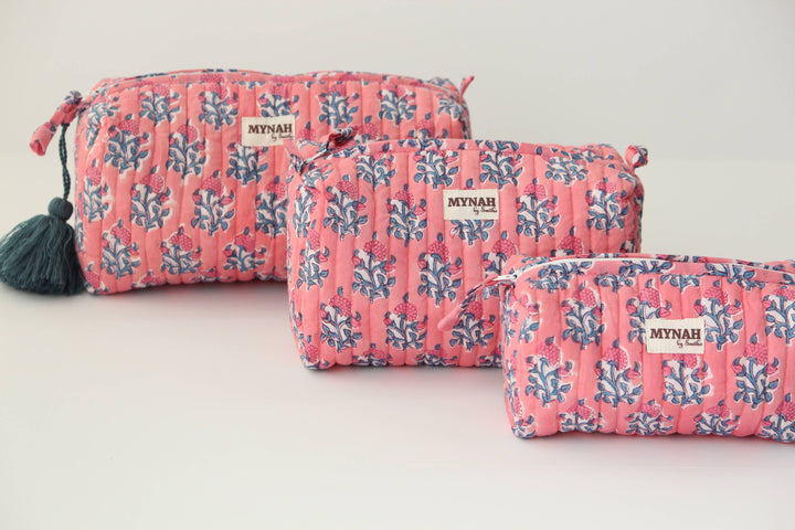 Hand block printed quilted makeup/toiletry bag with waterproof lining.