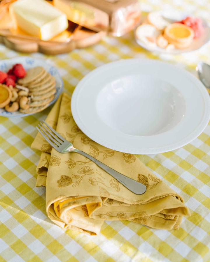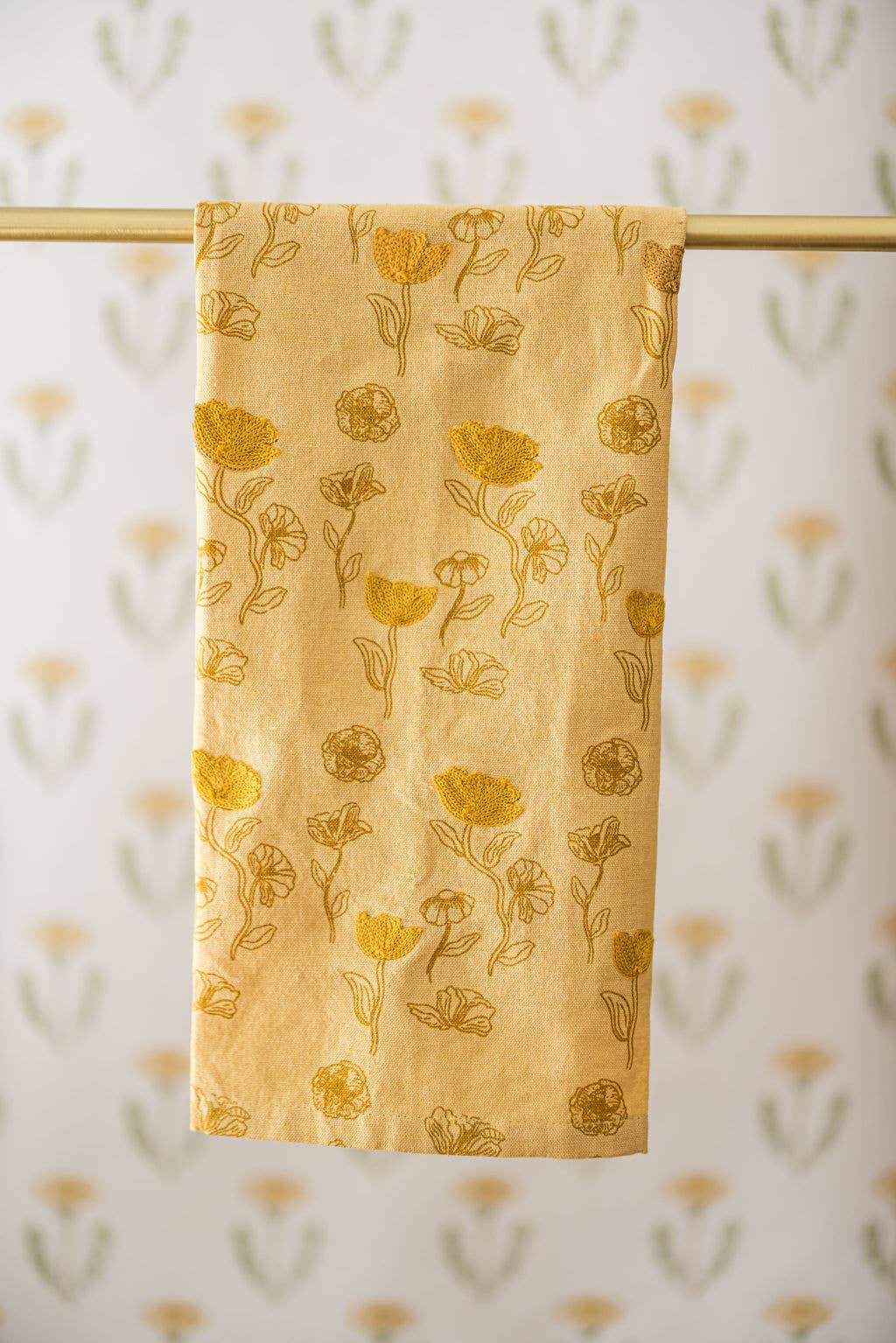 Made from high quality 100% cotton, this European inspired towel features a timeless yellow background color with a floral pattern and embroidered flowers throughout.